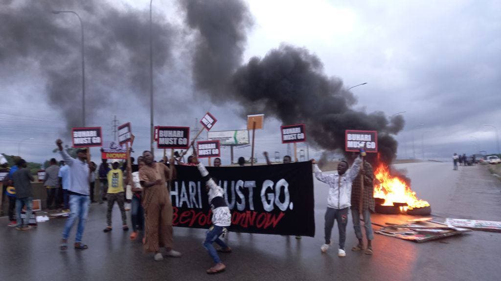 The protesters assembled along the Dantata Bridge on the popular Airport Road in Abuja with placards bearing the inscription #Buhari must go.