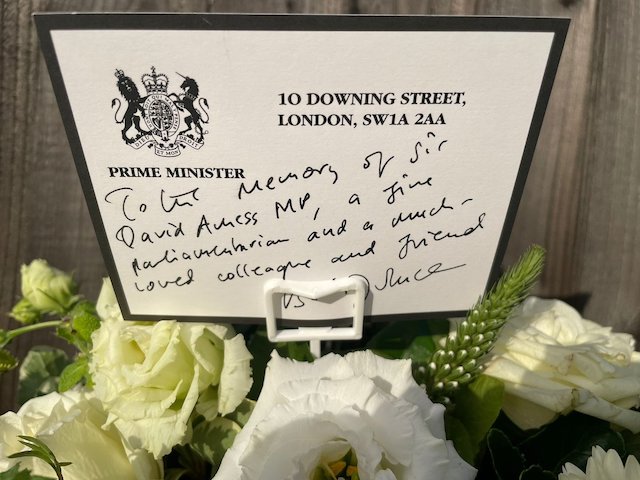 “To the memory of Sir David Amess MP, a fine parliamentarian and a much-loved colleague and friend,” Johnson said in a hand-written note placed in the flowers.