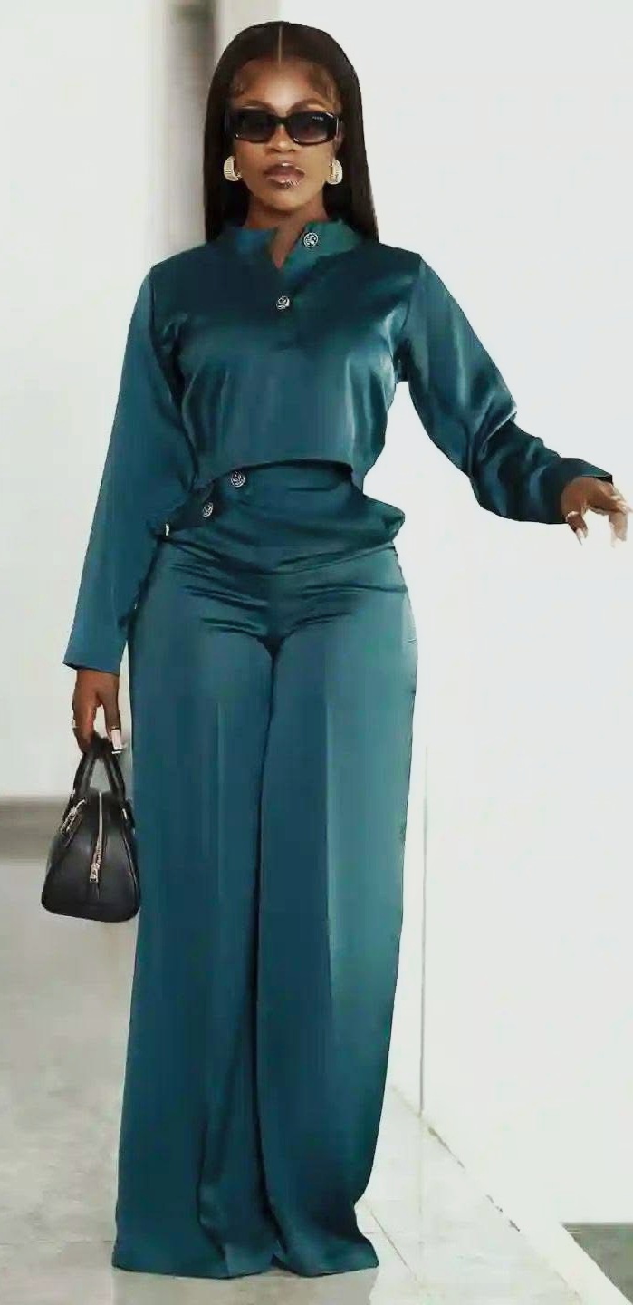 The Pearl dress with its simple two-piece silhouette entails a teal green Mikado fabric tailored into a long-sleeved crop top and a pair of baggy pallazo pants. Even though the dress appears simple in look, Kehinde has delivered it with a great sense of craftsmanship.