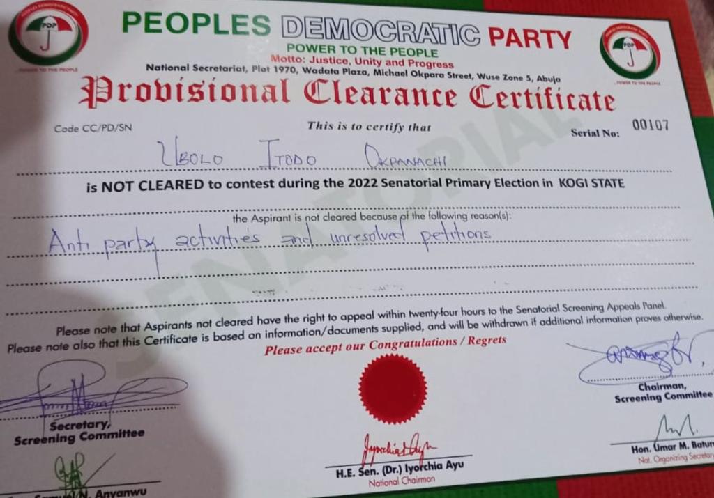 Though the 2017 constitution of the PDP, as amended, allows members who defected from the party to return, such returning members are to fulfill certain conditions to be considered for elective positions, which in the estimation of the screening committee, Okpanachi has not fulfilled.