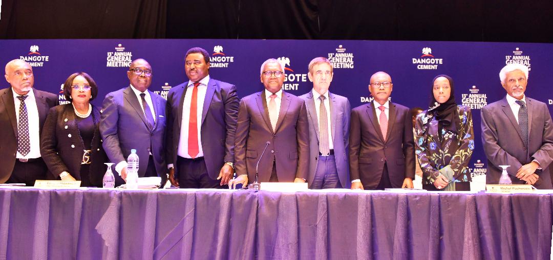 L-R: Independent Non-Executive Director, Dangote Cement Plc, Emmanuel Ikazoboh; Independent Non-Executive Director, Dangote Cement Plc, Dorothy Udeme Ufot, SAN; Independent Non-Executive Director, Dangote Cement Plc, Ernest Ebi; Deputy Company Secretary, Dangote Cement Plc, Edward Imoedemhe; Chairman, Dangote Cement Plc, Aliko Dangote; Group Managing Director/CEO, Dangote Cement Plc, Michel Puchercos; Non-Executive Director, Dangote Cement Plc, Olakunle Alake; Non-Executive Director, Dangote Cement Plc, Halima Aliko-Dangote; Deputy Group Managing Director, Dangote Cement Plc, Philip Mathew, at the 13th Annual General Meeting of Dangote Cement Plc, held in Lagos on 14th June, 2022