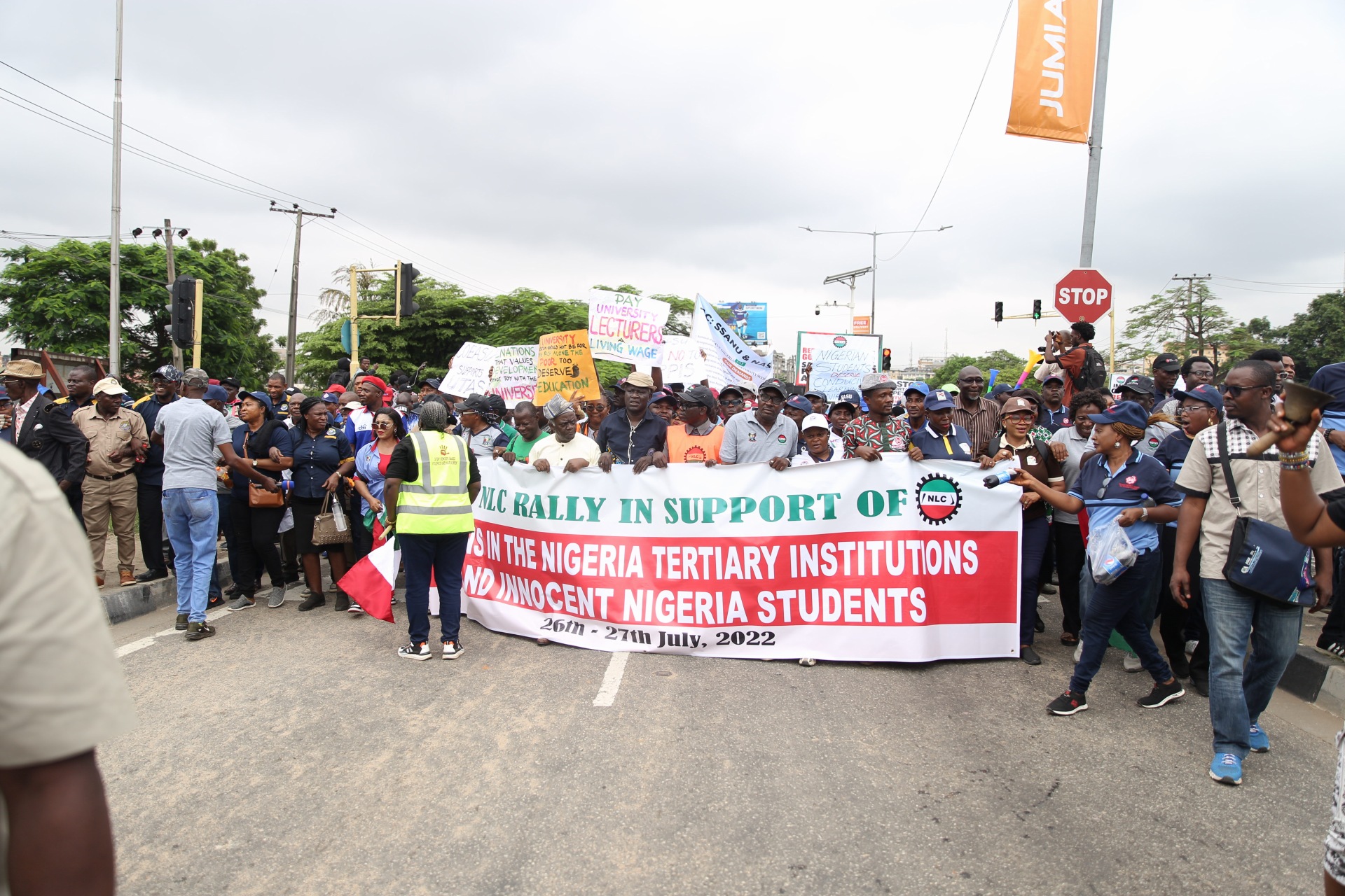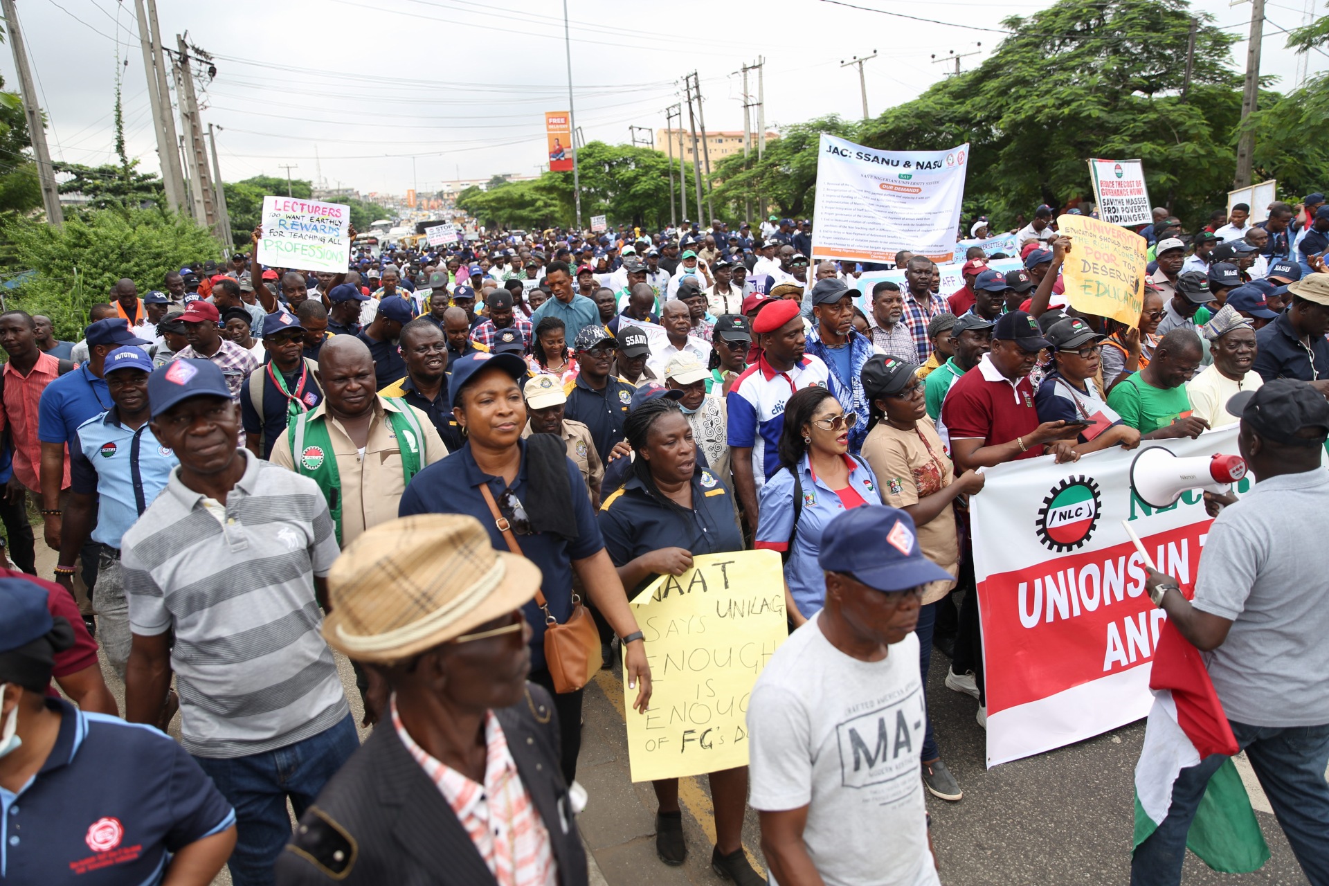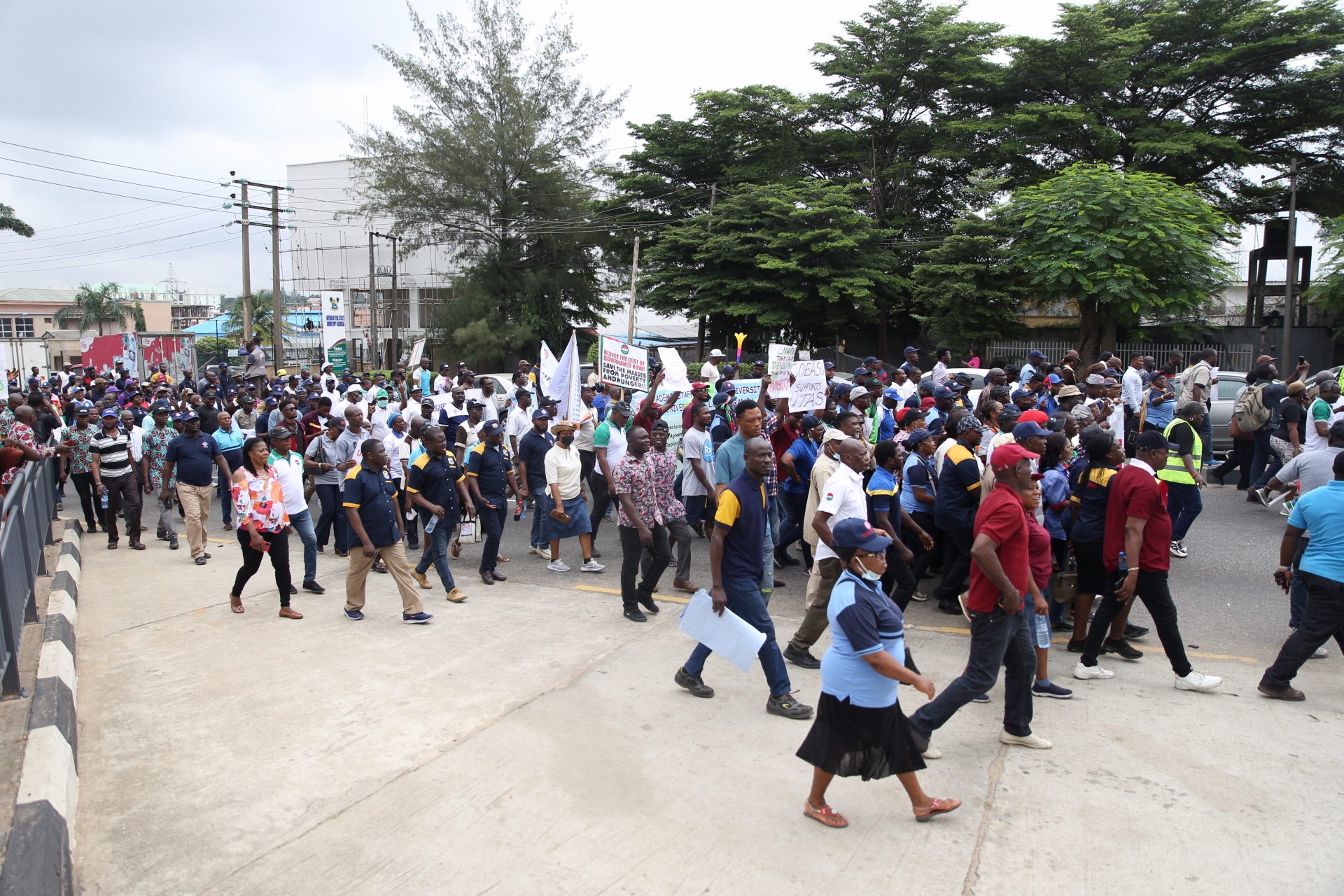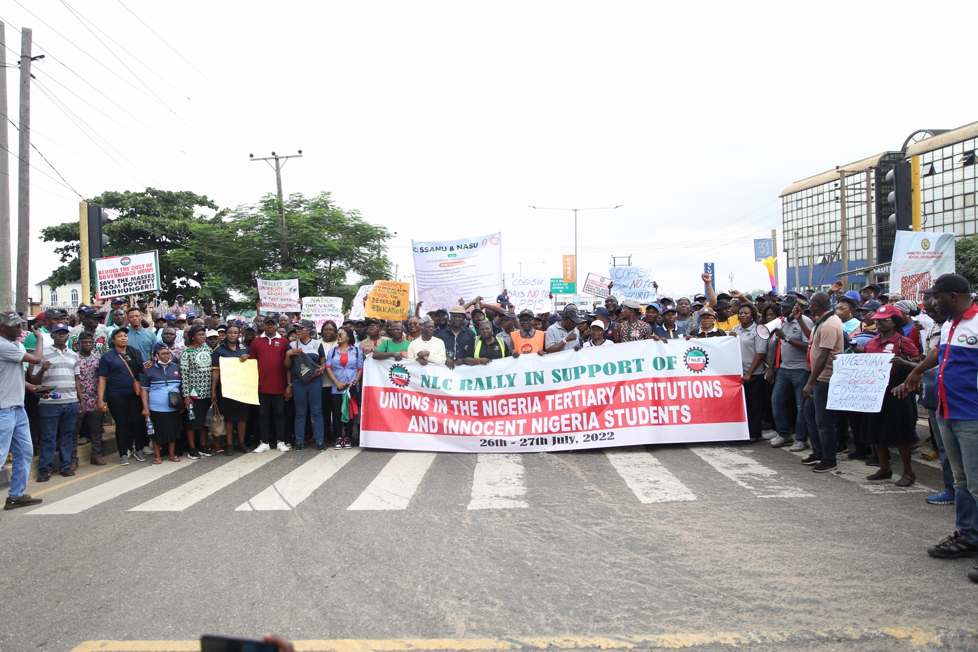 Members of the Nigeria Labour Congress protesting in solidarity with striking lecturers have arrived at the Lagos State Government Secretariat.