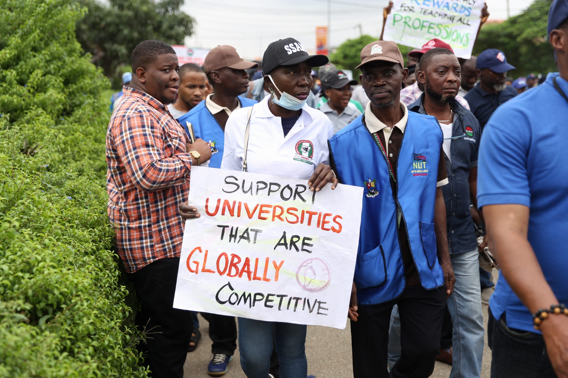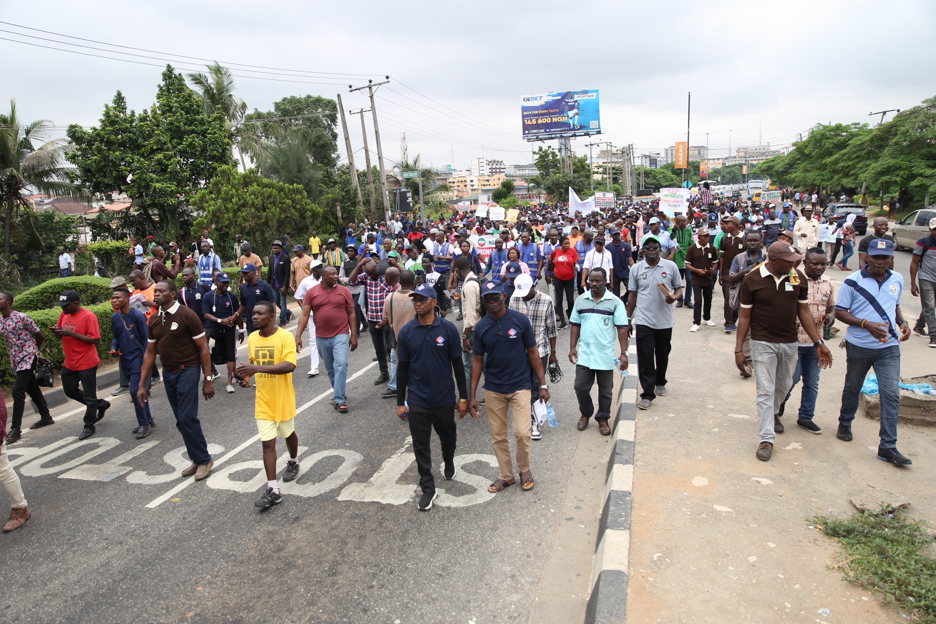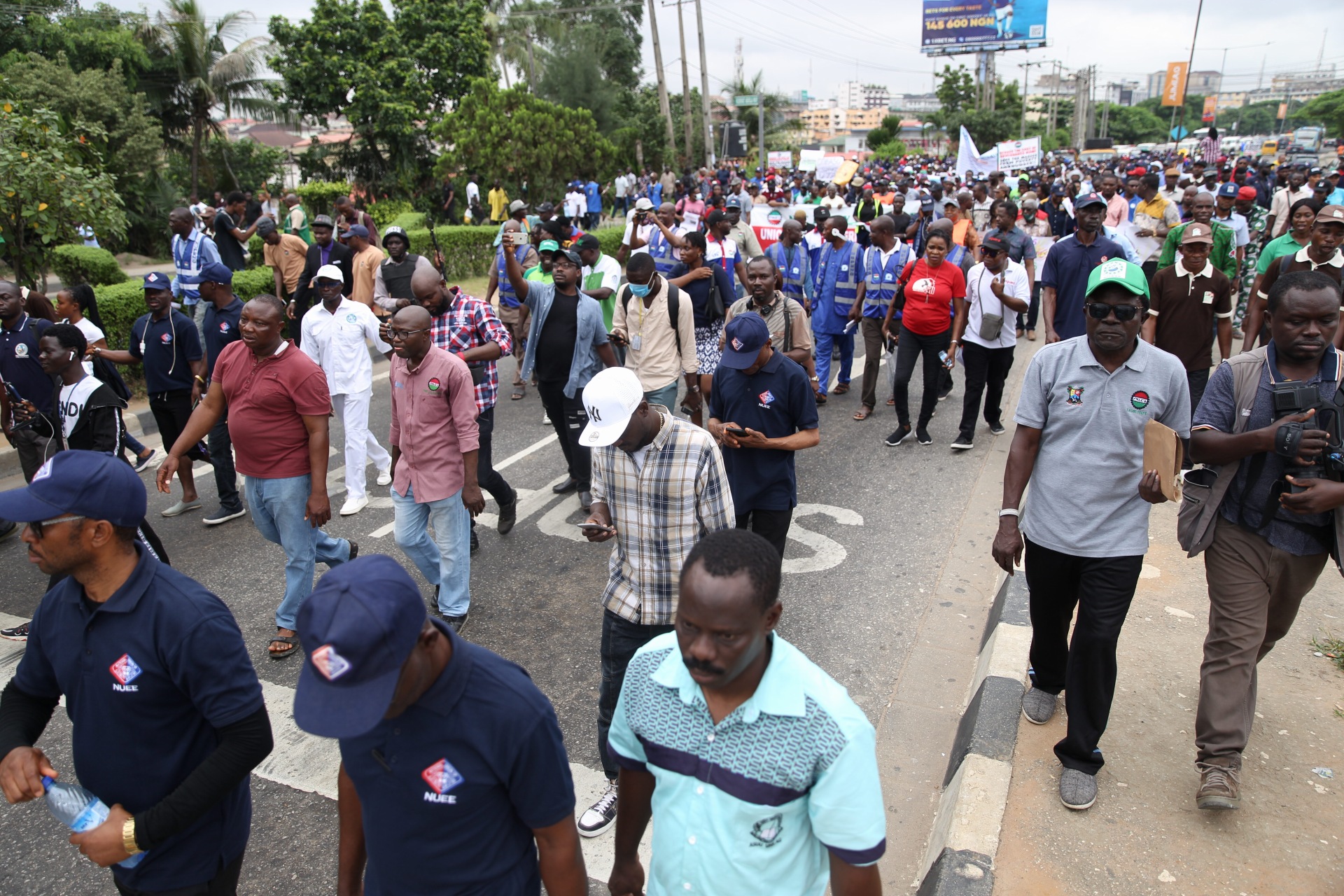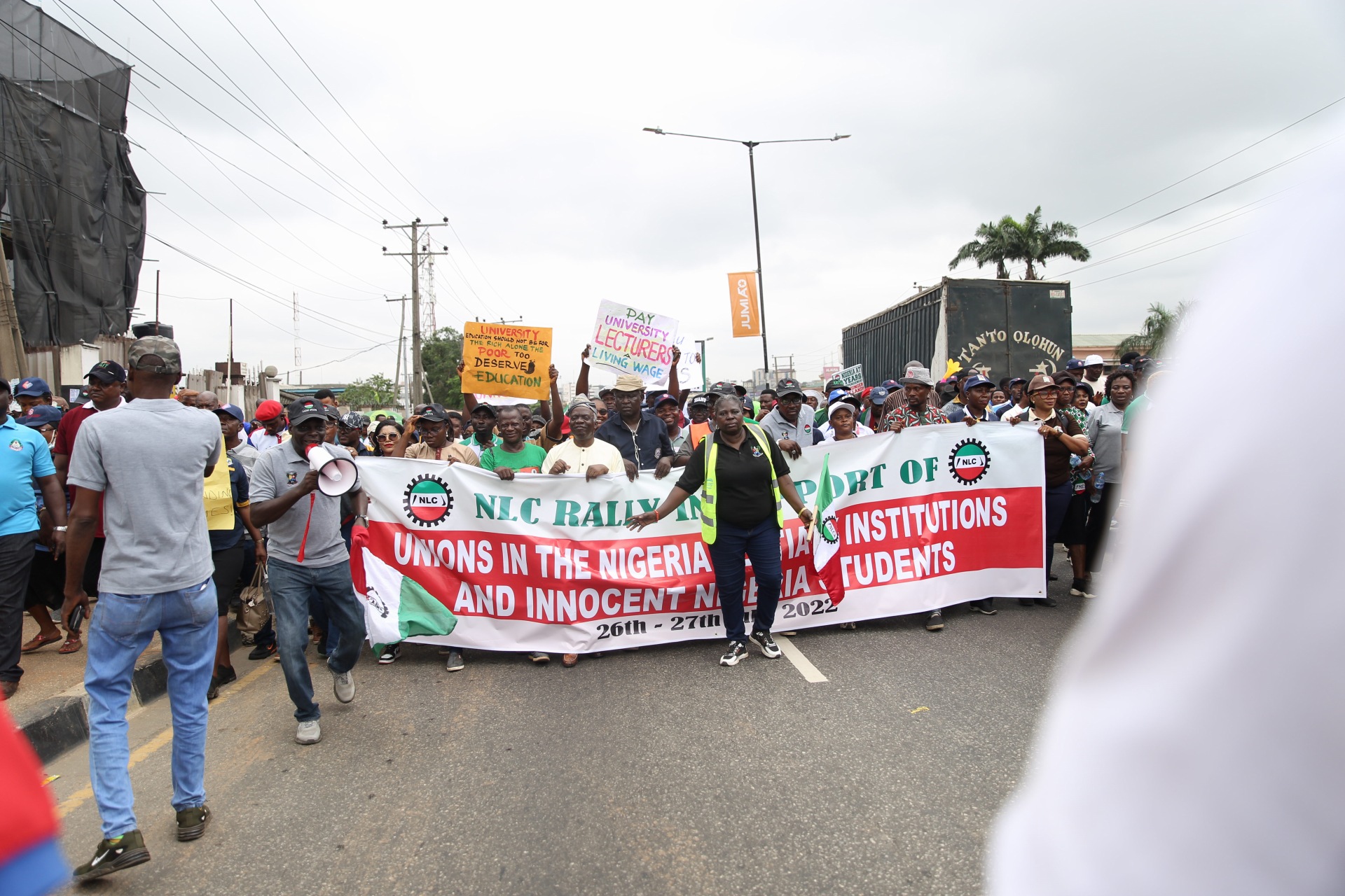 Members of the Nigeria Labour Congress protesting in solidarity with striking lecturers have arrived at the Lagos State Government Secretariat.