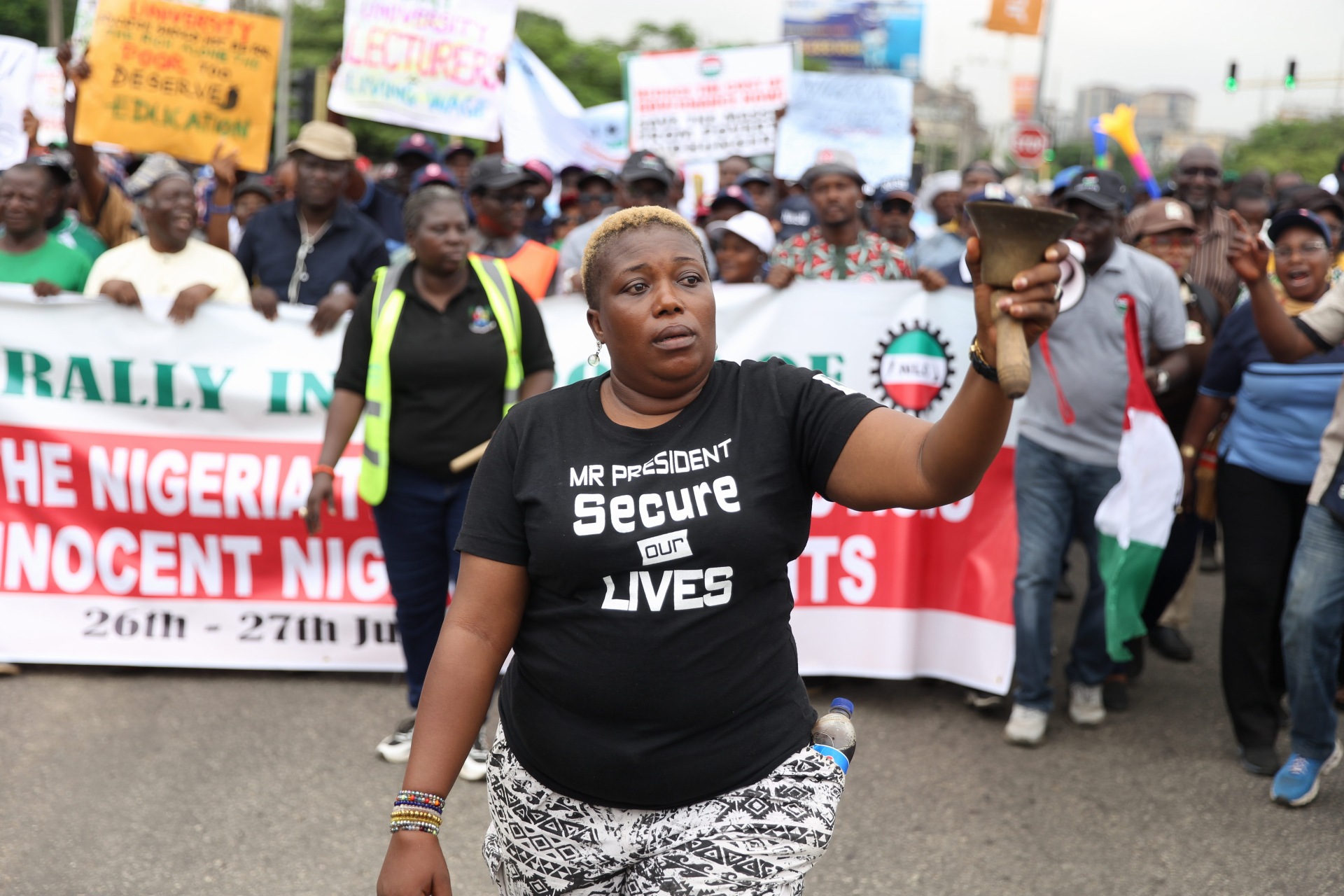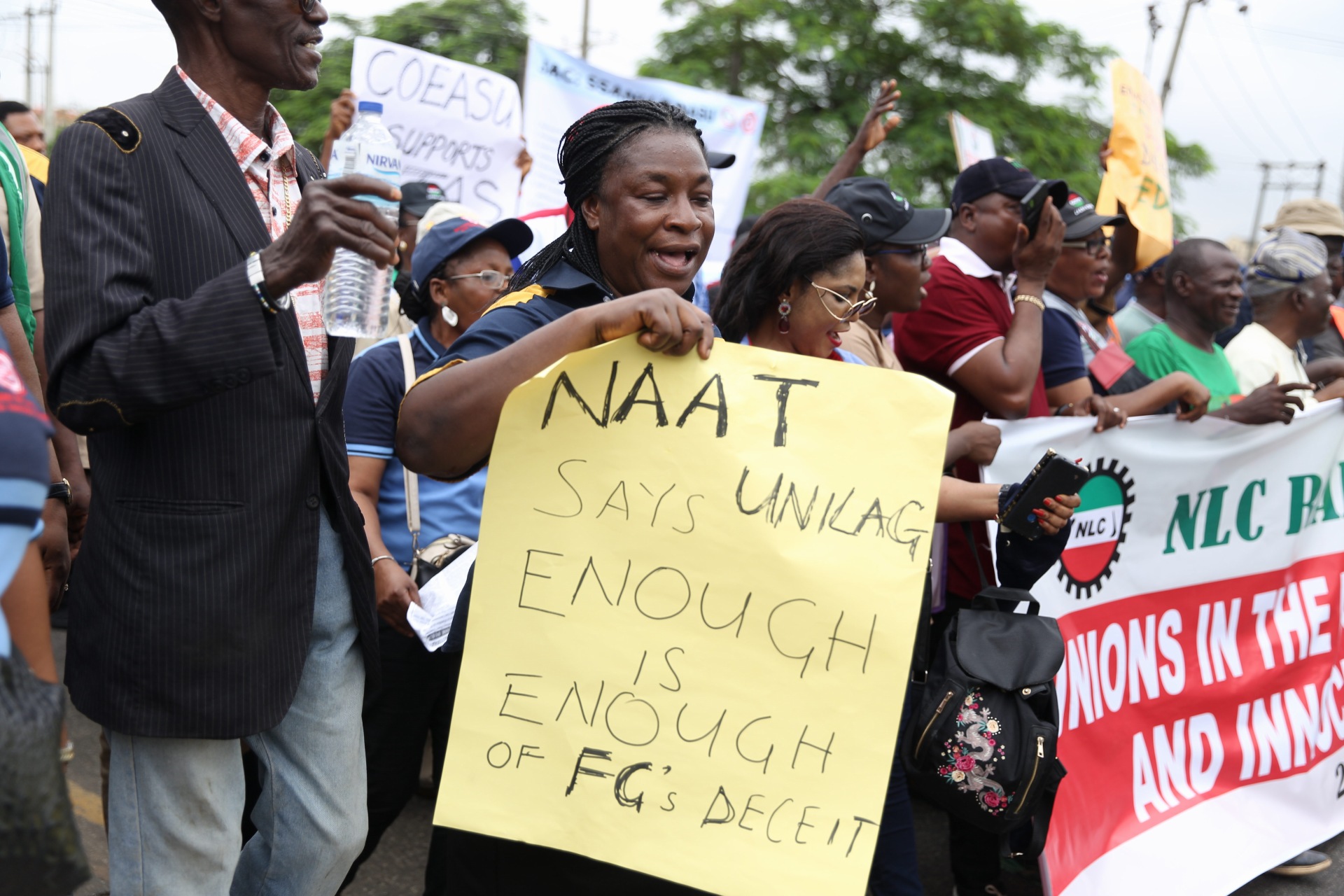 The protesters who carried placards with different inscriptions were led by Mrs. Funmi Sessi, Lagos state chairman of NLC, and Human Rights Activist, Barrister Femi Falana.