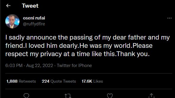 Oseni in his tweet also asked the public to respect his privacy at this time of mourning.