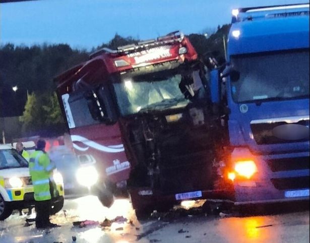 The crashed two lorries this morning on M25 where the police officer got injured. (Image: MyLondon)