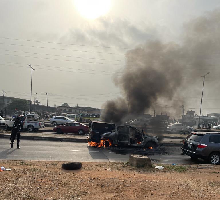 A vehicle was set ablaze on the expressway as police battled to maintain peace and order. Many vehicles were vandalised in the process.