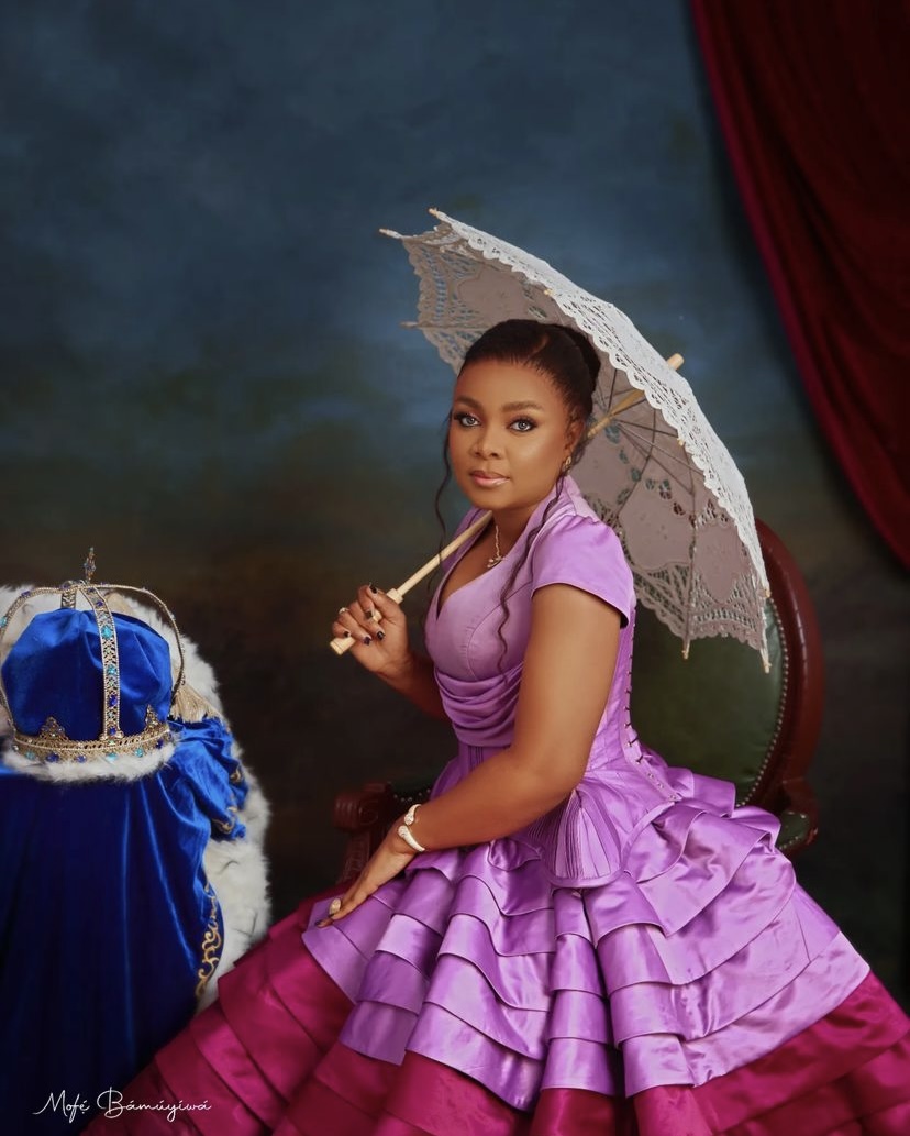 A Nigerian princess herself, Bimbo looked lady-like in a pink and wine-toned ruffled and layered dress. She completed the sultry look with minimal make-up, accessories and a white lacey parasol.
