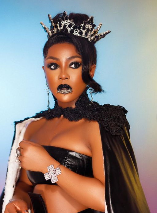 Styled by Toyin Lawani, the former BBNaija housemate was clad in a black leather piece that barely covered her body and a long cape. Her attire have gathered a lot of negative reactions.