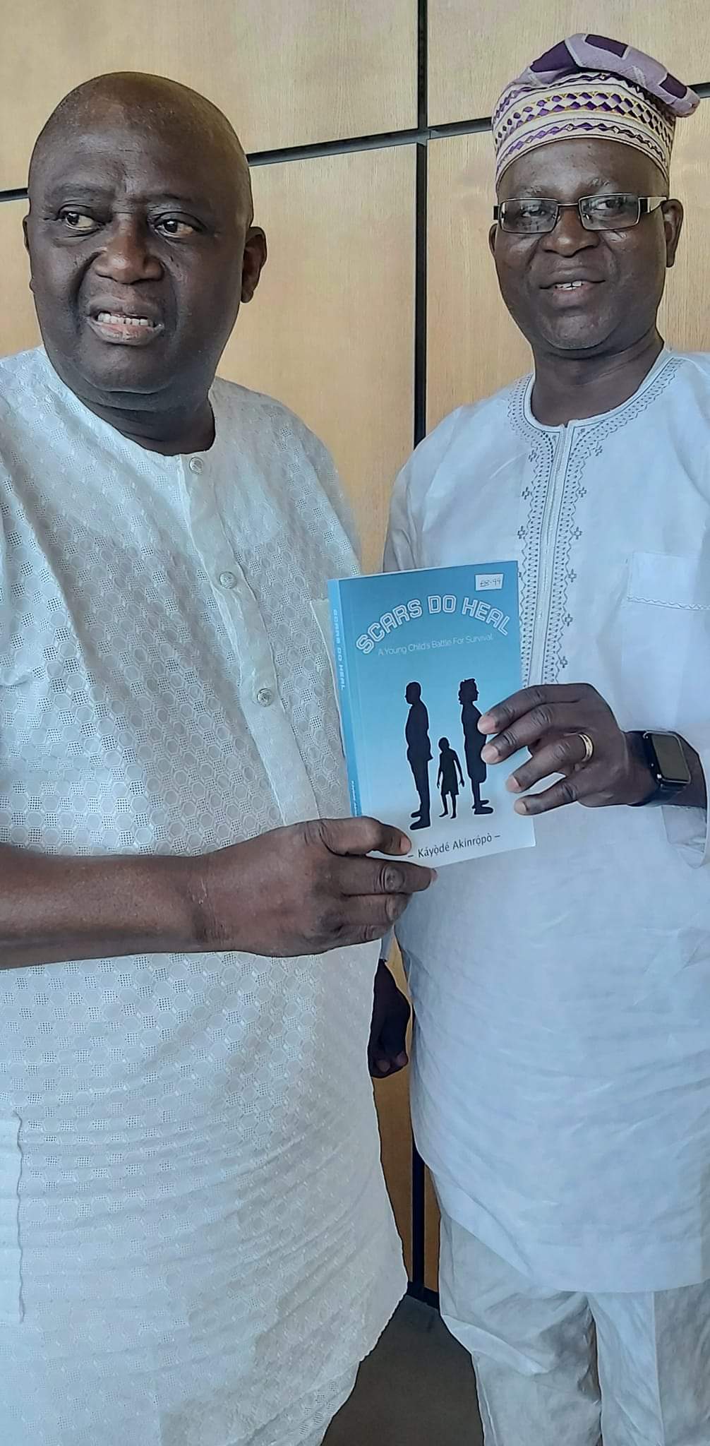 Chairman of Peter Bradford Group, Idowu Osuolale Obasa (left) and the author of SCARS DO HEAL, Kayode Akinropo displaying a copy of the novel