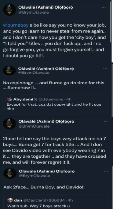 “Former of the track titles I mentioned above is there to point me to the fact that the latter, and his album title is the hook I sing on my album title track ‘Macabre’.. burna na really boy.. and that’s a crime.!! An actual crime…To do time for… and if una like make una resurrect legends to come complain about stolen songs… una go regret this shit to numerous degrees… shey una no dey hear word !!.” The rapper also claimed that he was attacked by seven boys, which 2Face corroborated.