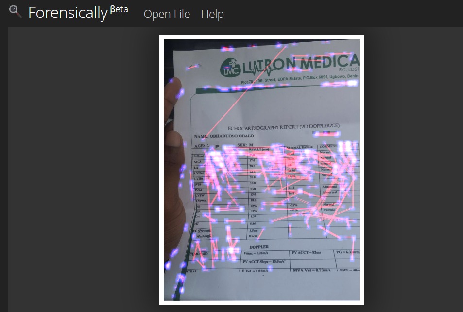 So, to ascertain if Odalo forged his echocardiography report, DUBAWA used the digital image forensics tool Forensically, to analyse it. A clone detection analysis with the tool showed that the document contained significant noise levels, meaning it had been manipulated. Consistent with Lutron’s hospital staff comment, details of the result have been altered at different points, particularly on the first page, where Odalo’s details appeared.