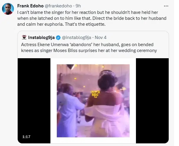 Popular television host, Frank Edoho, has criticized singer Moses Bliss for embracing actress Ekene Umenwa after she knelt before him, abandoning her bridegroom at her wedding ceremony.