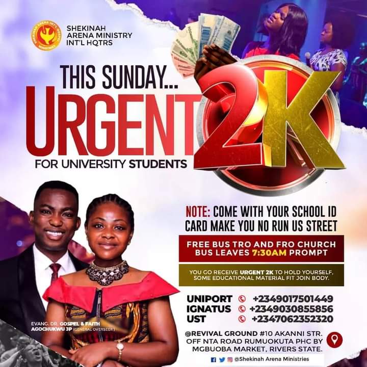 A Port-Harcourt based church, the Shekinah Arena Ministry International, has scheduled next Sunday to give each university student that makes it to its service N2,000.