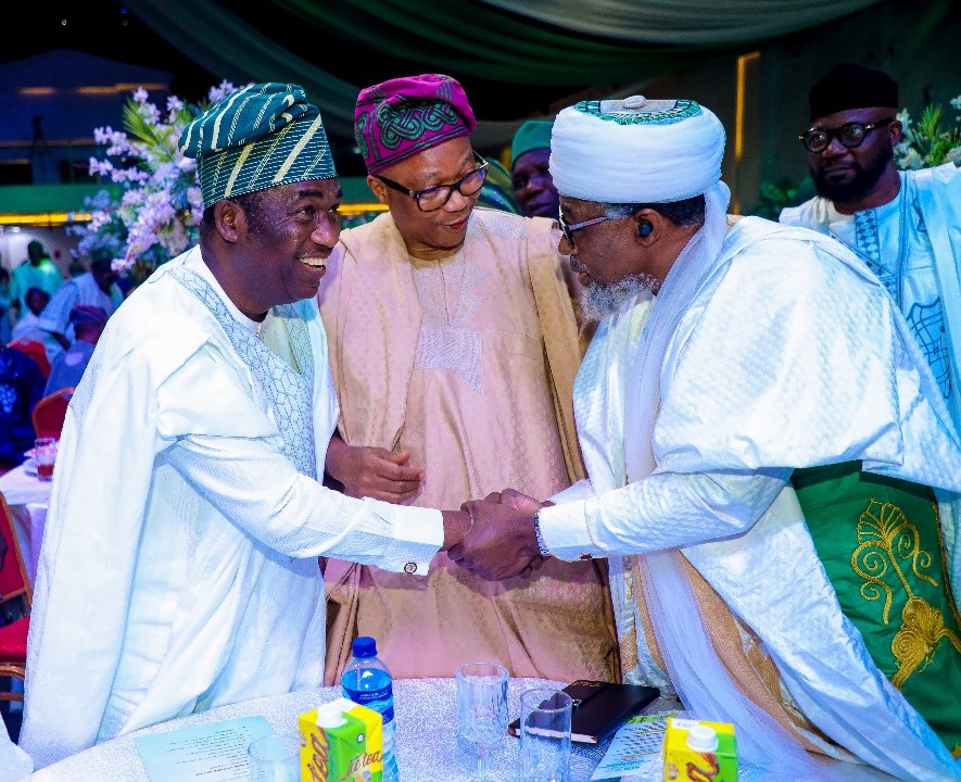 L-R: Lagos State Deputy Governor, Dr. Kadri Obafemi Hamzat; Chairman of the Occasion, Mr. Tajudeen Afolabi Adeola and National Missioner, Ansar-ud-Deen of Nigeria, Sheik Abdur Rahman Ahmad at the Ansar-ud-Deen Centenary Dinner held on Thursday, at Balmoral Convention Centre, Ikeja.