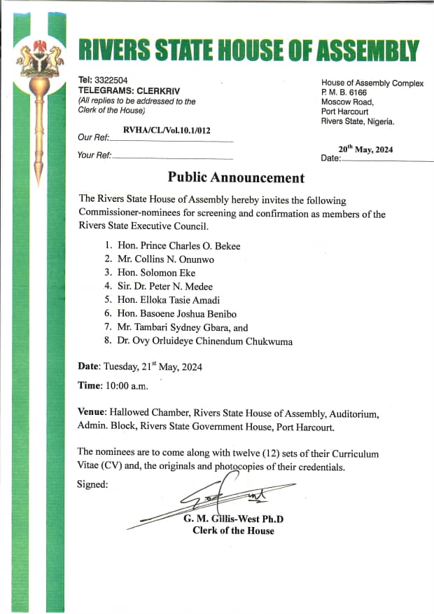 Members of the Rivers State House of Assembly loyal to Governor Siminalayi Fubara,  have invited for screening eight persons nominated as commissioners by the governor.