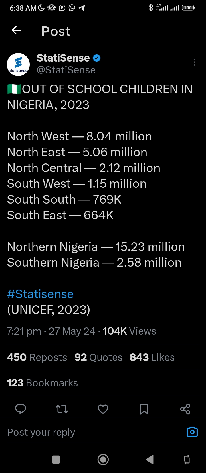 Northern Nigeria has 15.23 million out-of- school children. This is according to a report posted on the X handle of Statisense.