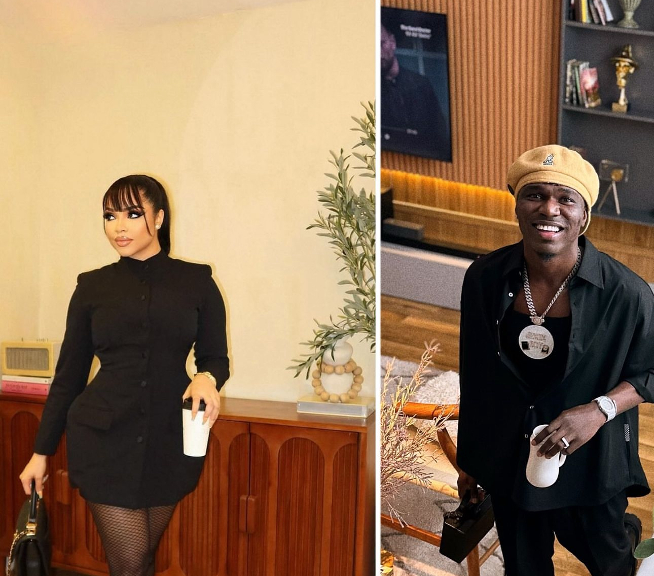 Sharing a combined picture of him and Nengi donning similar outfits on Sunday via his Instagram page, Spyro wrote, “Of all days Nengi chose to wear black, hold a white cup, carry a black bag and snap on a brown flooring with a flower tree at the background Same day I happened to be doing the same things.