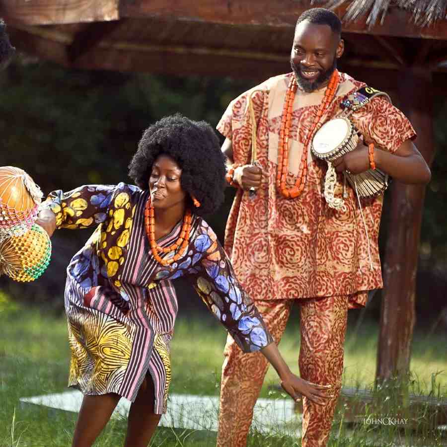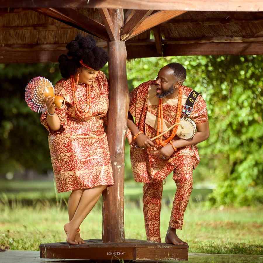 The photos feature the couple in matching red Yoruba traditional attire, adorned with elegant beads.