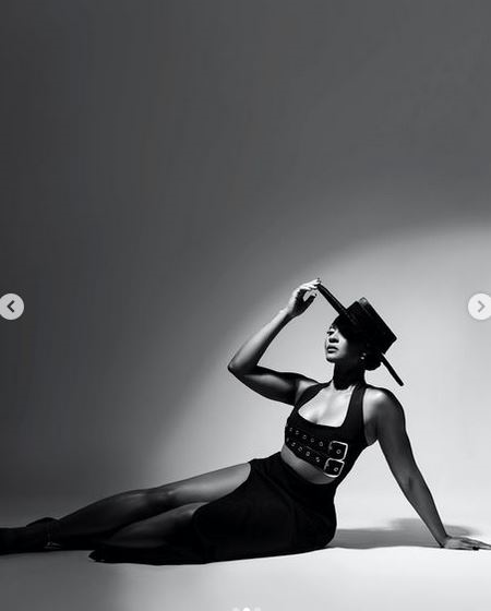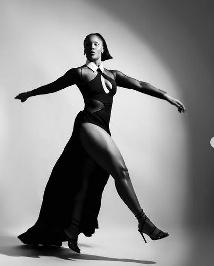 The photos showcase Osas in a chic black dress with a thigh-high slit, accentuating her toned figure.