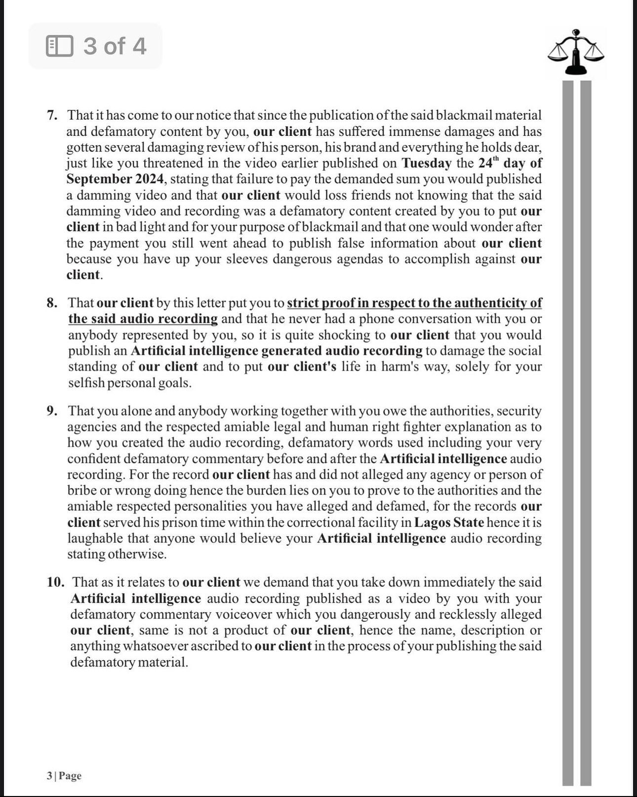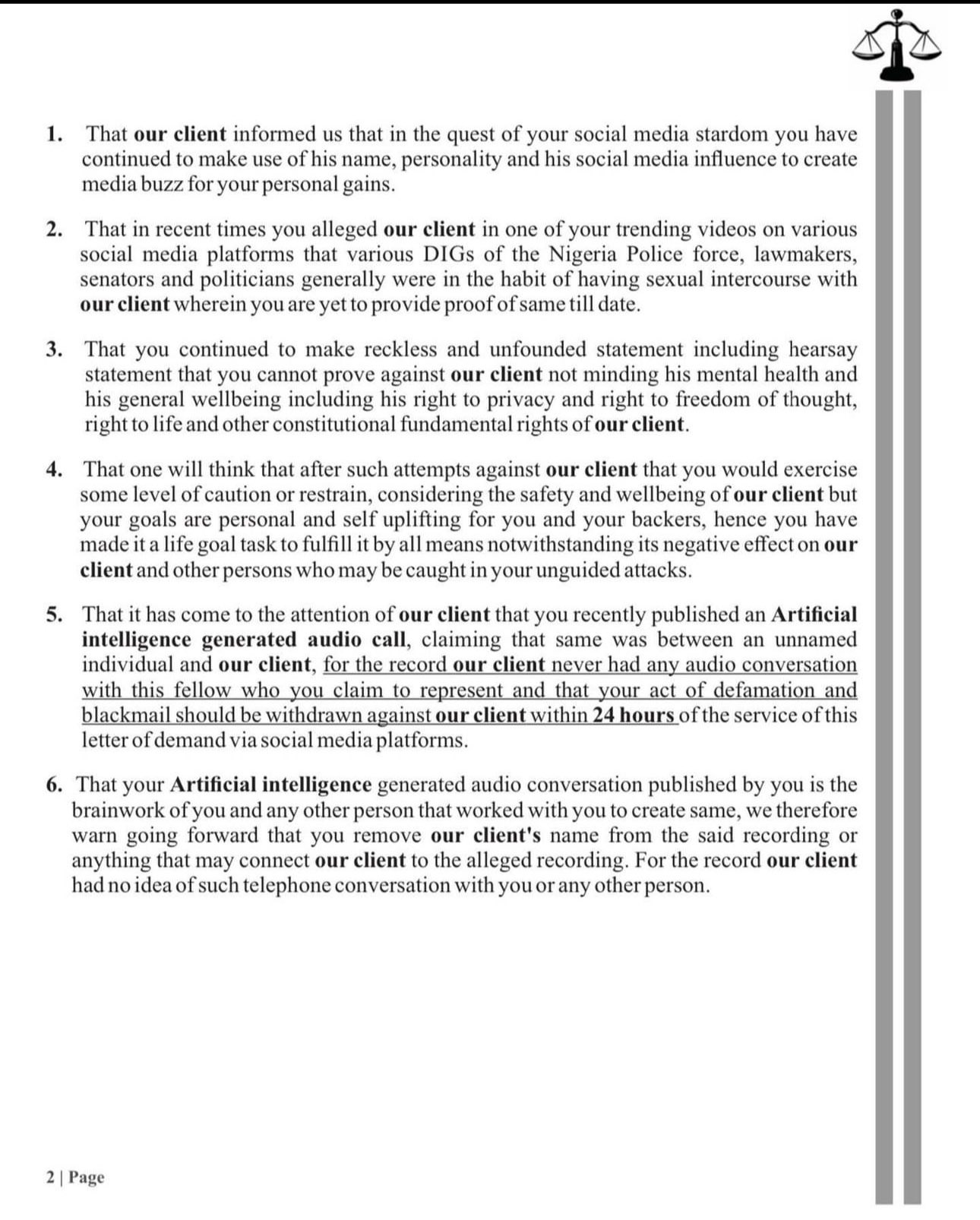 Sharing a letter from her lawyers via her social media account, Bobrisky sued VDM for N1 billion as damages and gave him 24 hours to publish a written and video recording apology.