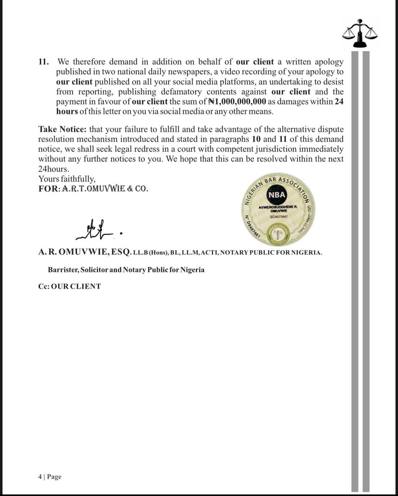 Sharing a letter from her lawyers via her social media account, Bobrisky sued VDM for N1 billion as damages and gave him 24 hours to publish a written and video recording apology.