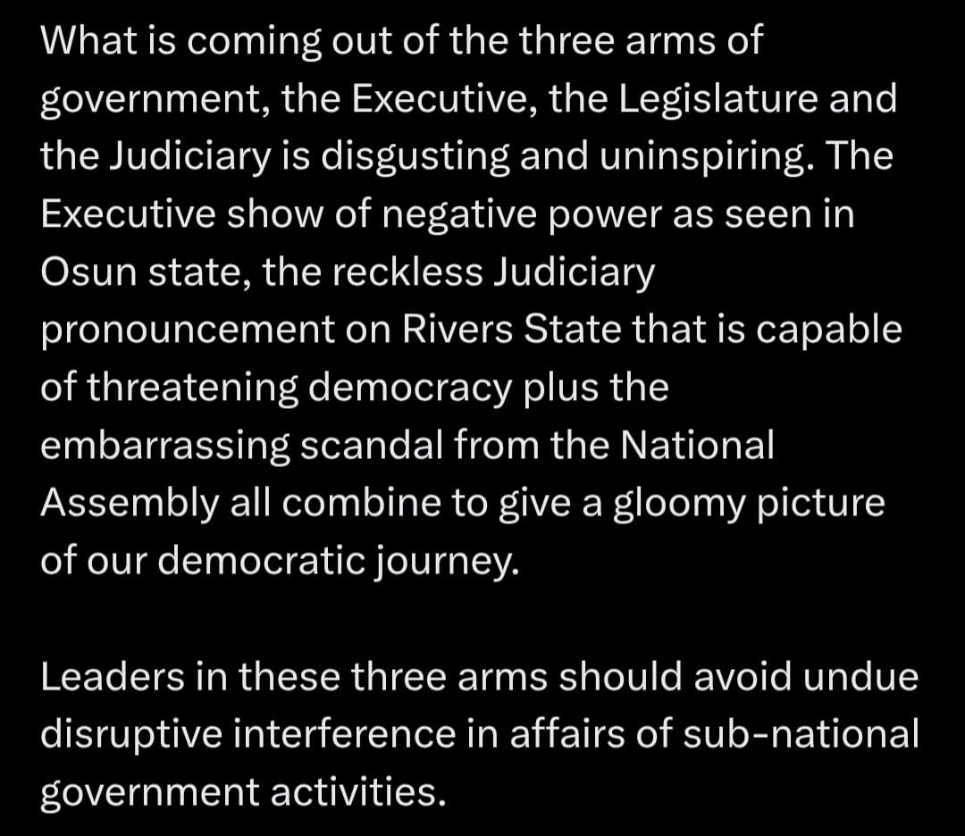The statement authored by Obi reads: “My attention has been drawn to a news report saying that I described the Supreme Court ruling on Rivers State as reckless.
