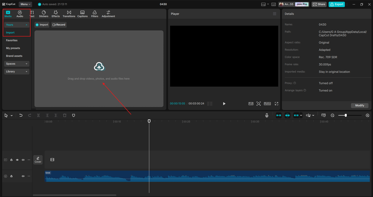 Open CapCut Desktop and start a new project. Drag and drop your video or audio file into the timeline. If you want to record a new voiceover, click the voice recording icon, then speak directly into your mic. Write a short script before you record. It helps keep your audio clean and focused.