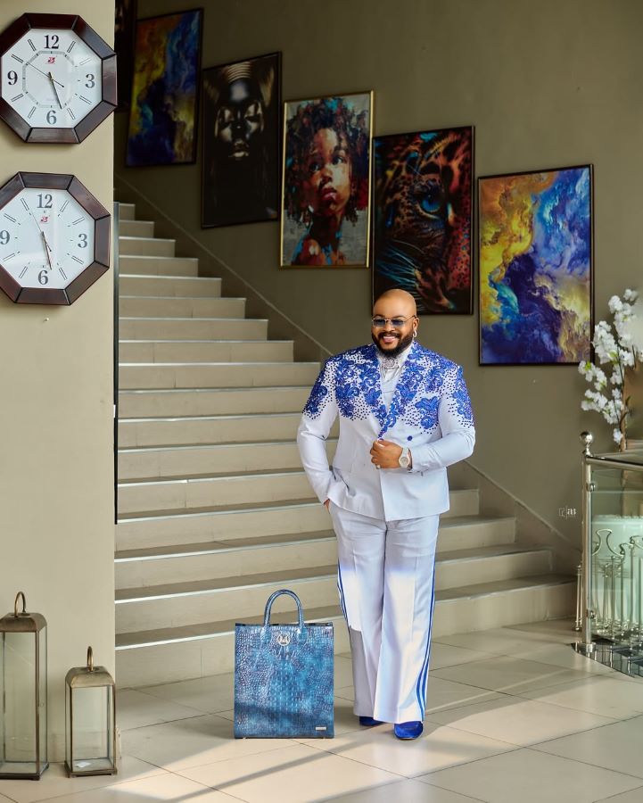 In the photos, he wore a white suit accented with royal blue embellishments, complementing his clean-shaven style.