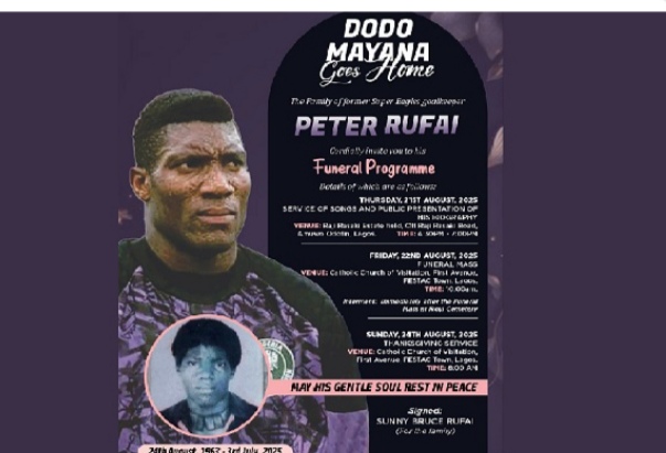The family of former Super Eagles goalkeeper Peter Rufai has announced the plans for his funeral. There will be a service of songs and the public unveiling of his biography on Thursday, August 21st.