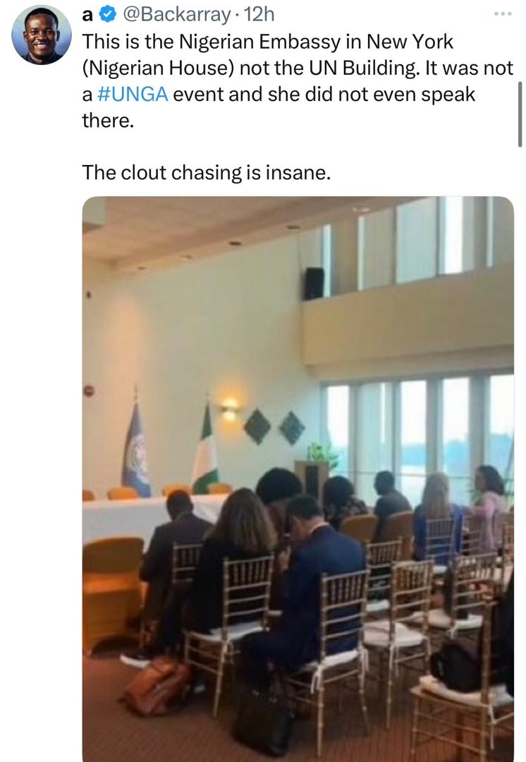Critics alleged that the photo she shared was taken at the Nigerian Embassy in New York, not inside the UN building.