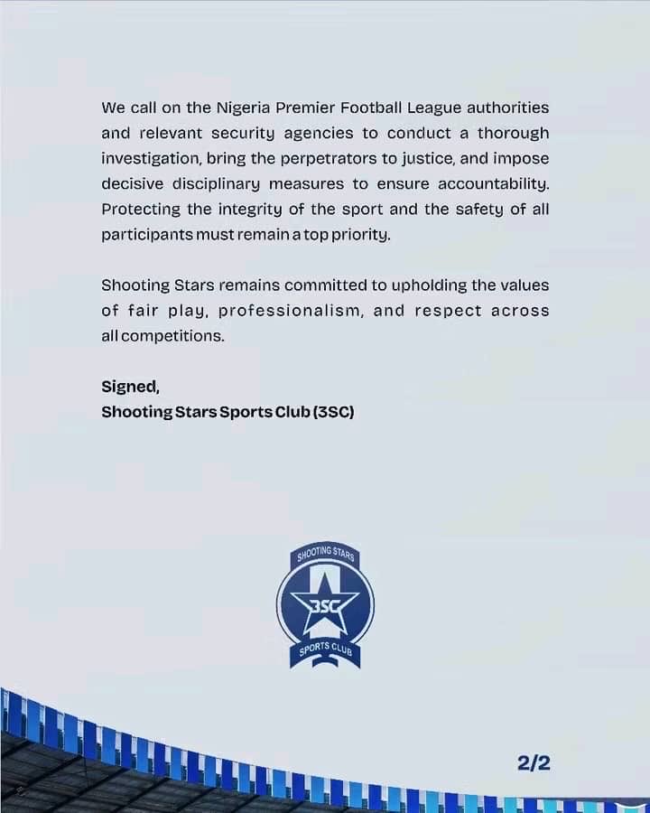 “The management of Shooting Stars Sports Club unequivocally condemns this appalling act of violence. Football must remain a force for unity, passion, and community. There is absolutely no place for violence or intimidation within the game,” it added while calling on authorities of NPFL and security agencies to take appropriate action to protect the integrity of the league and safety of players.