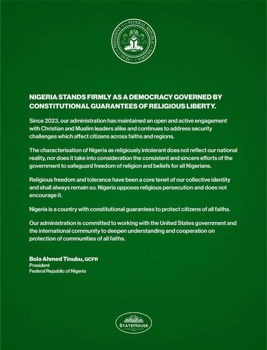 President Bola Ahmed Tinubu has reaffirmed Nigeria’s unwavering commitment to religious freedom amid the allegation of  genocide  against Christians in the country by the Donald Trump administration.