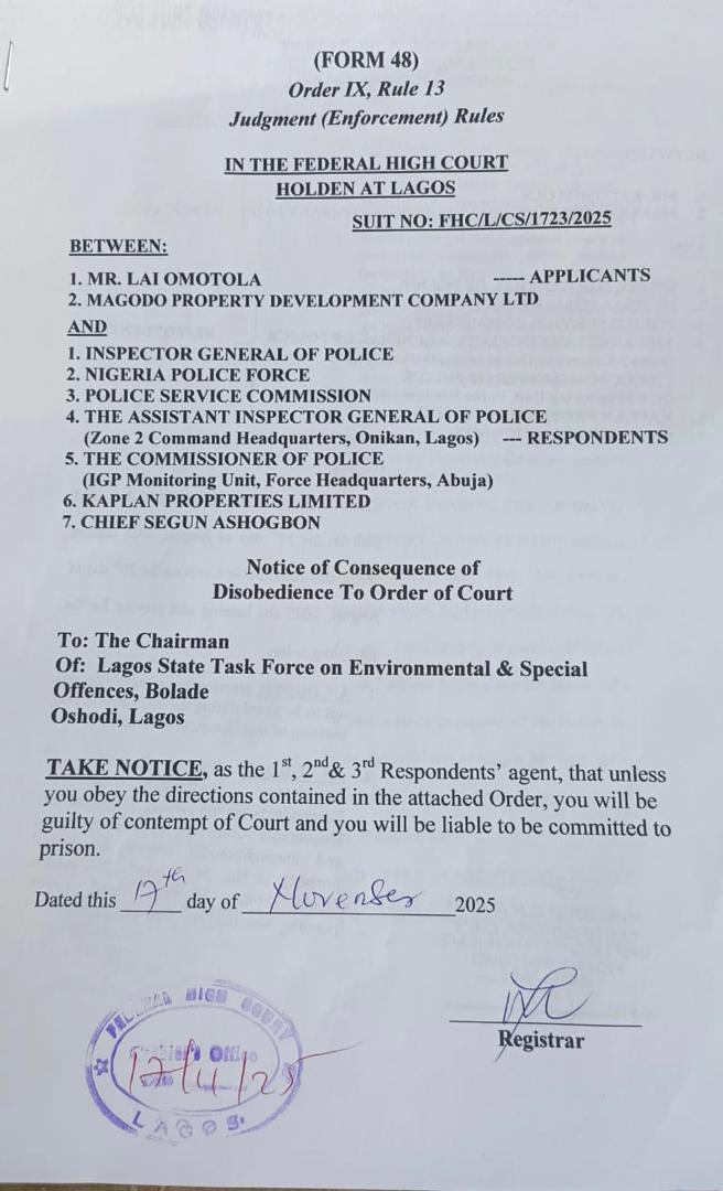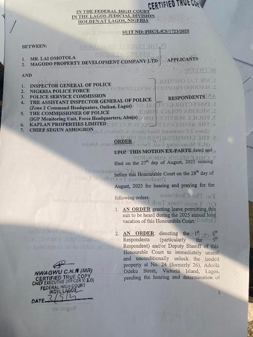 Magodo Property Development Company, through its solicitor stated that it challenged the sealing at the Federal High Court and secured an order directing that the property be reopened, arguing that police officers have no authority to seal or enforce possession over a civil land dispute.