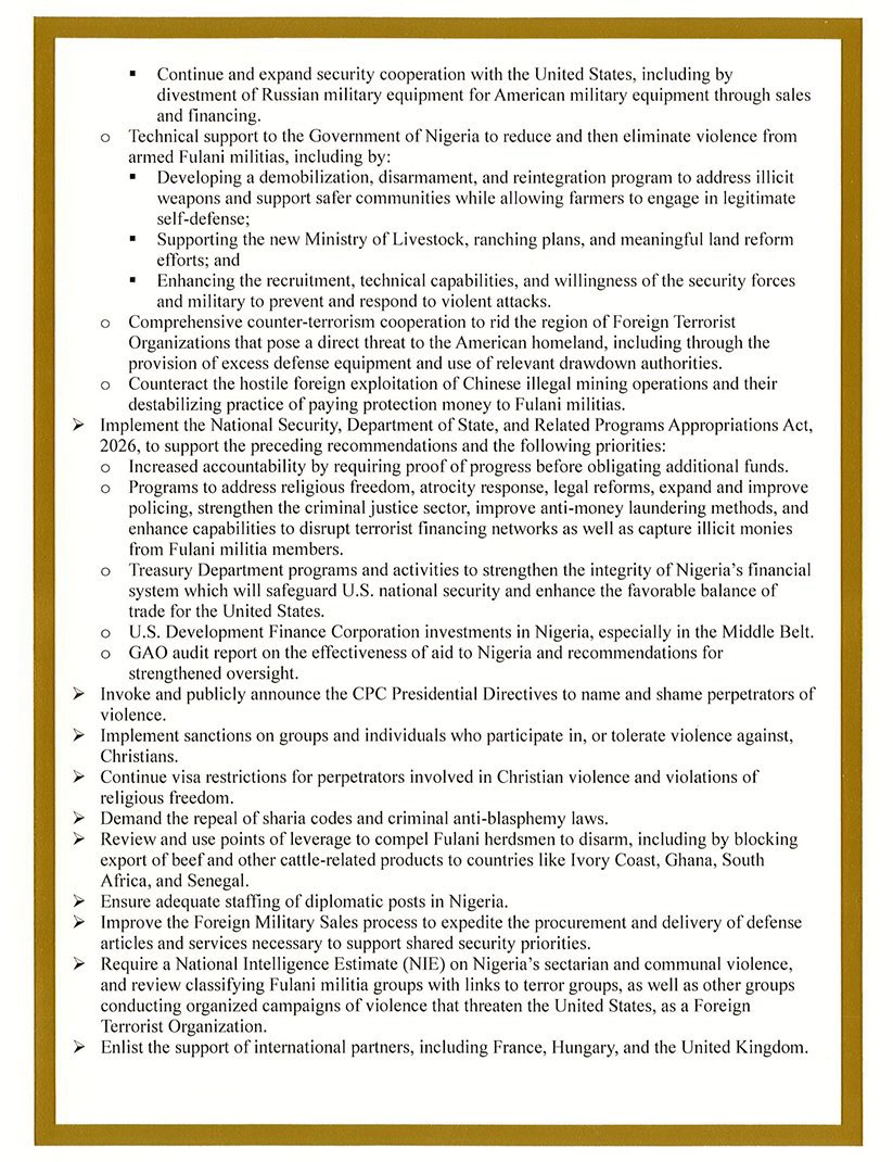 Among key recommendations in the report are the establishment of a bilateral U.S.–Nigeria security agreement to protect vulnerable Christian communities and dismantle jihadist networks, the withholding of certain U.S. funds pending measurable action by the Nigerian government, as well as sanctions and visa restrictions on individuals implicated in religious persecution.