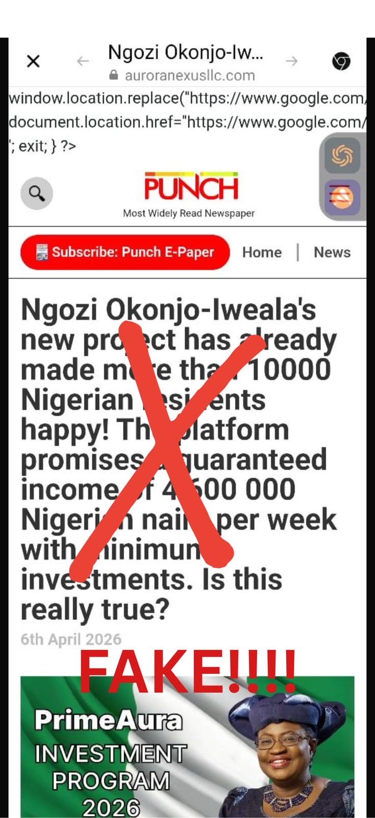 The purported advert for the project, Prime Aura Programme was placed in a newspaper with obviously cloned masthead of The Punch Newspaper.